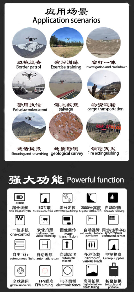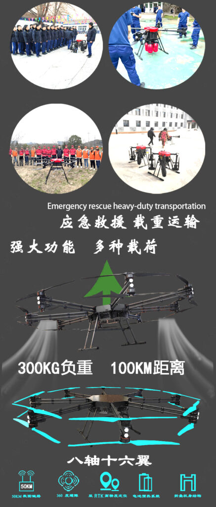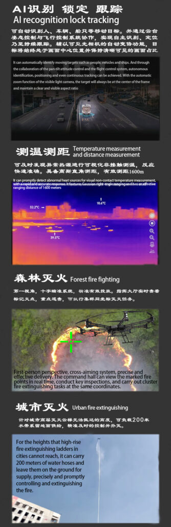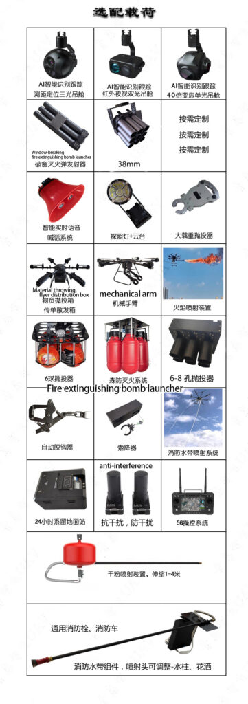The company provides customized solutions for various fields such as multi-purpose, multi-scenario, fire protection, civil use, and special purposes. We can customize various types of drones according to users’ demands. Our company is a research and development and manufacturing enterprise, with an experienced R&D team. We have over 50 types of drones and more than 100 mission payloads, with a focus on large transport drones, fire-fighting drones, fixed-wing multi-purpose drones, etc. Provide multi-scenario accessories.