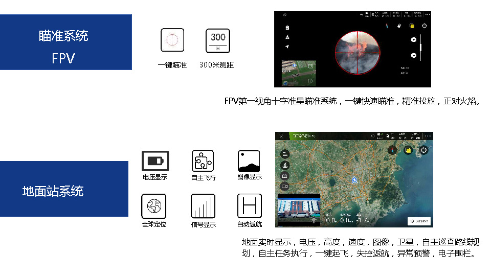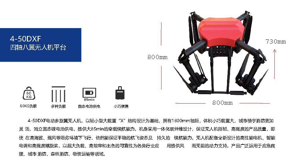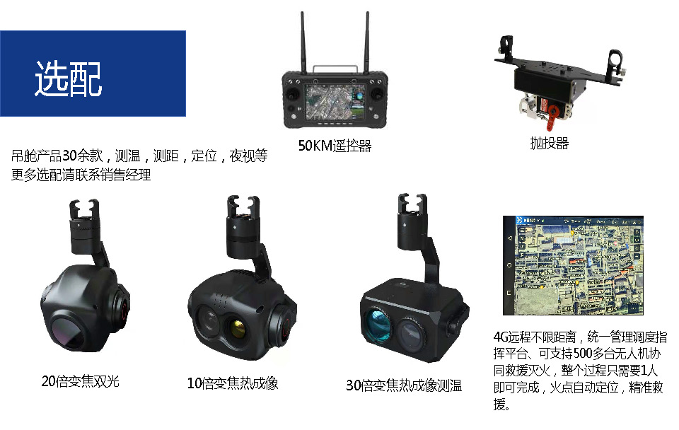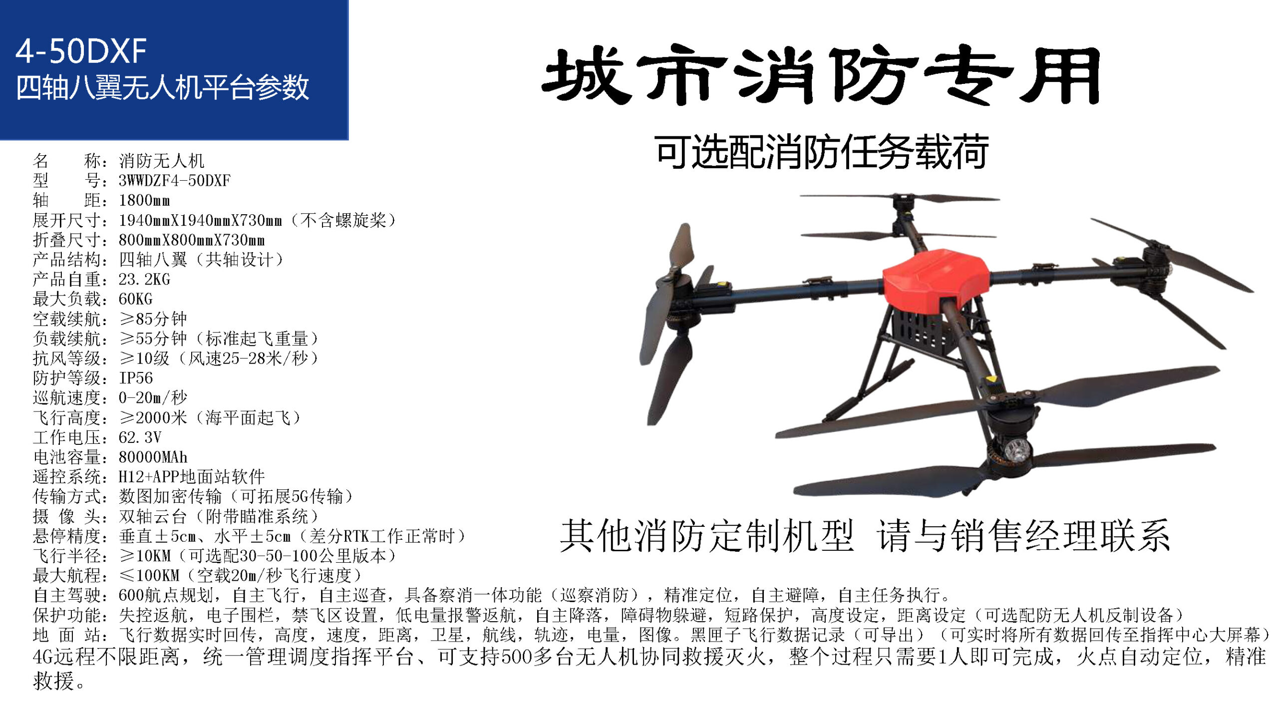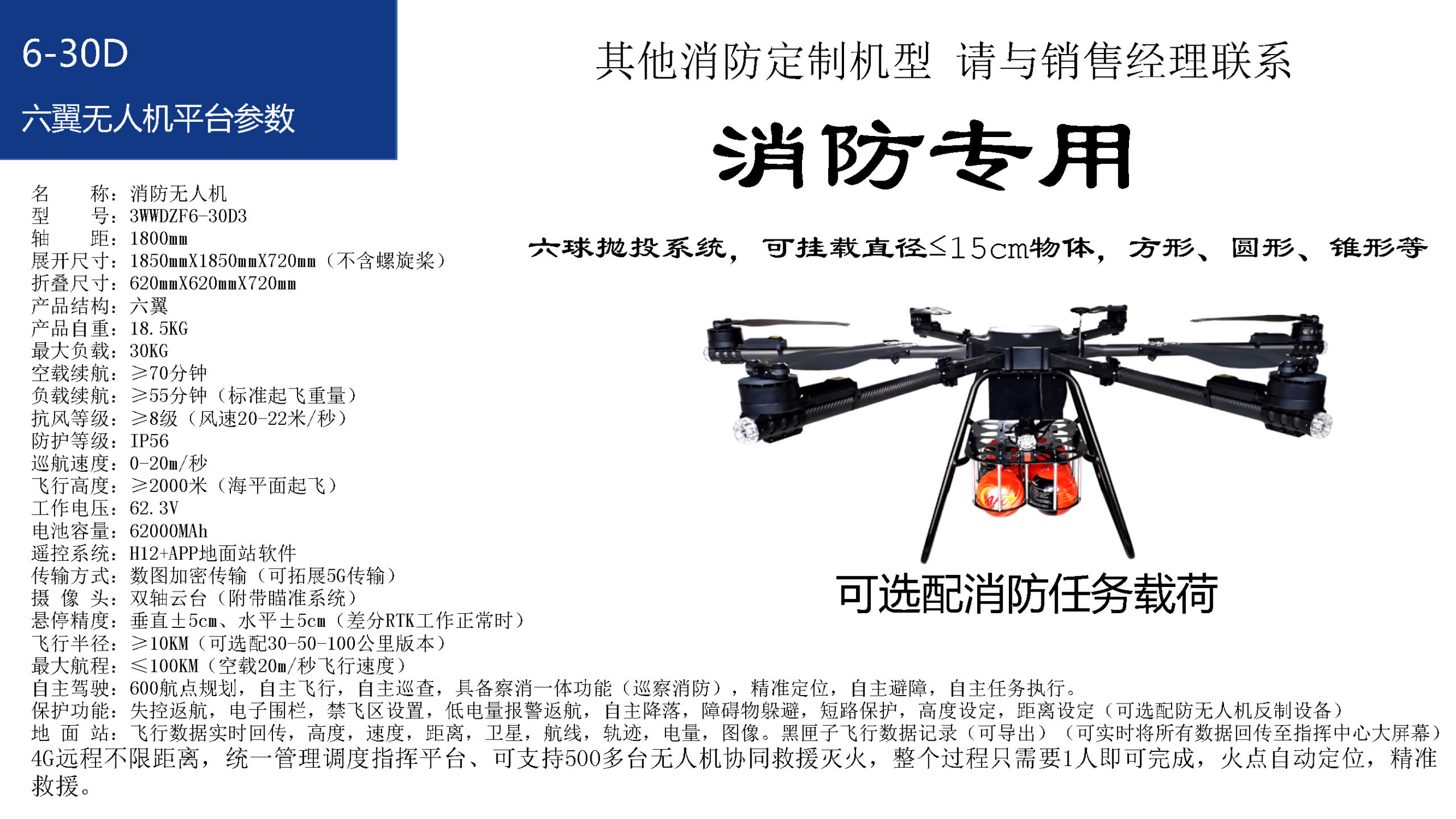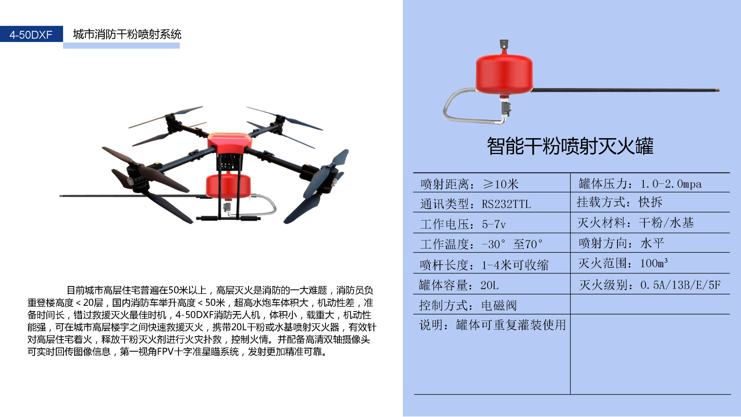 森林消防是消防中的一大难题,普遍火情发现晚,火势发展迅速,消防人员安全隐患大到达火灾现场用时久,尤其是偏远交通不便的区域发生火灾,消防设备无法抵达火灾现场载人直升机成本过高。4-50DXF携带1枚25L水基或干粉定高智能灭火弹,可自行设定爆破高度,(0-200米可设定)空中自爆形成屏障层灭火效果更好,并配备高清双轴摄像头可实时回传图像信息,第一视角FPV十字准星瞄系统,投弹更加精准可靠。巡查同时发现火情及时扑灭有效做到早发现早消灭,避免火势发展,真正的做到察消一体。灭火同时可在高空俯视地面观察火情发展,全面掌握火情信息辅助指挥员进行现场消防人员调度。
