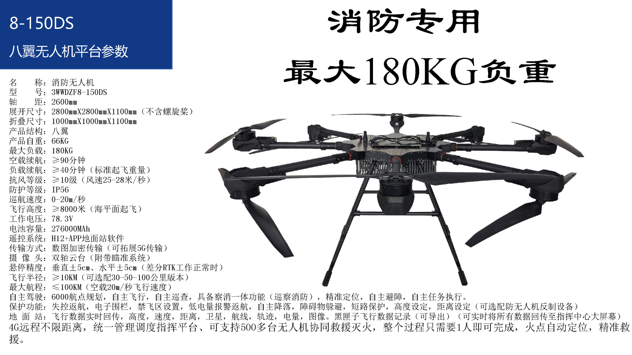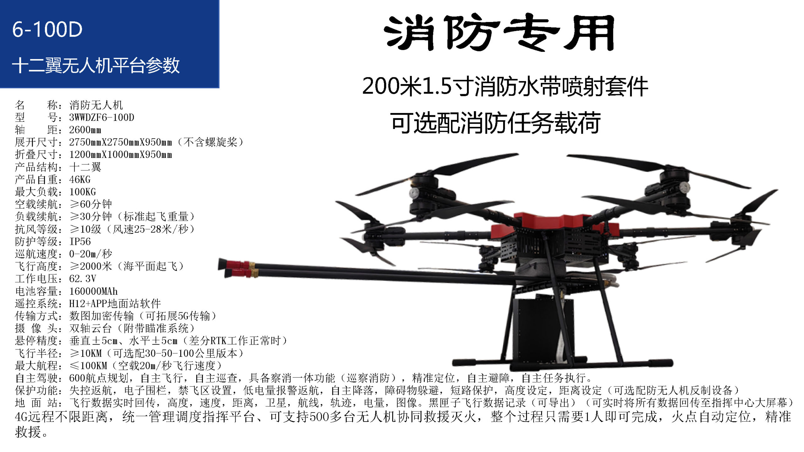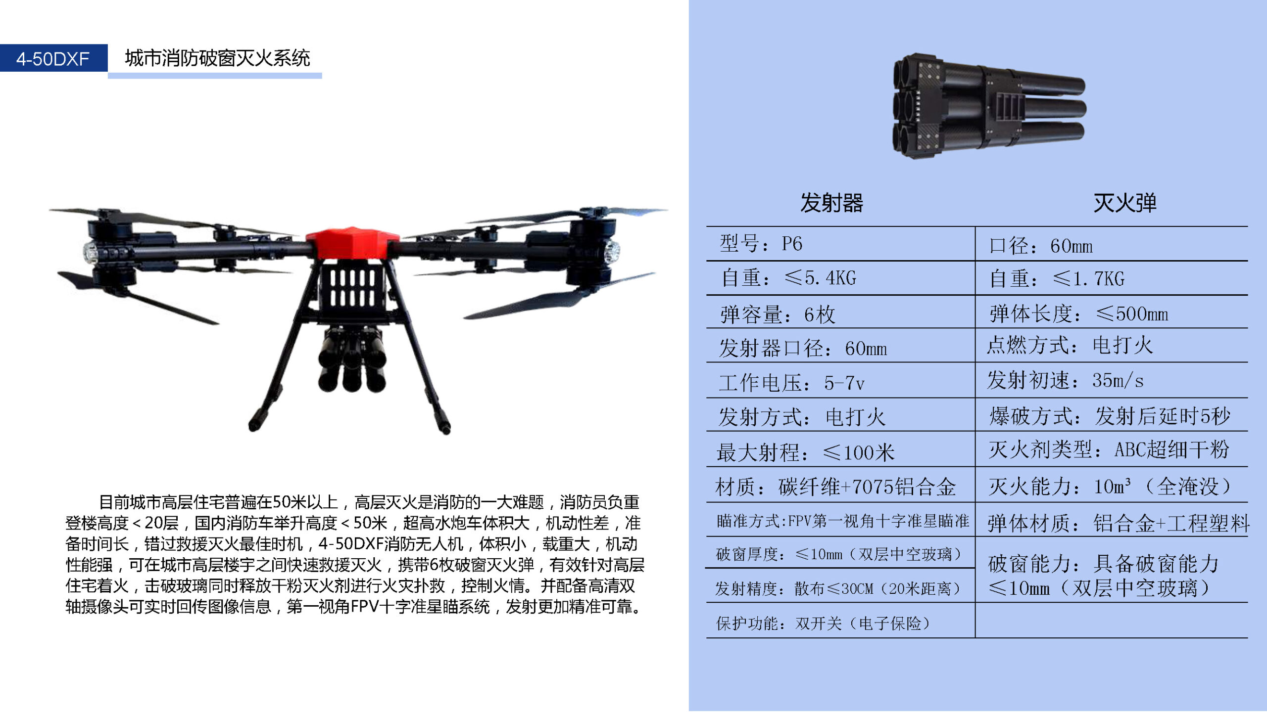 消防无人机,适合城市高楼和森林消防灭火。可以达到200-300米高楼喷射水、泡沫等灭火。可以投发射破窗灭火弹,可以定位瞄准投掷灭火弹,可以锁定并AI跟踪投掷灭火弹。