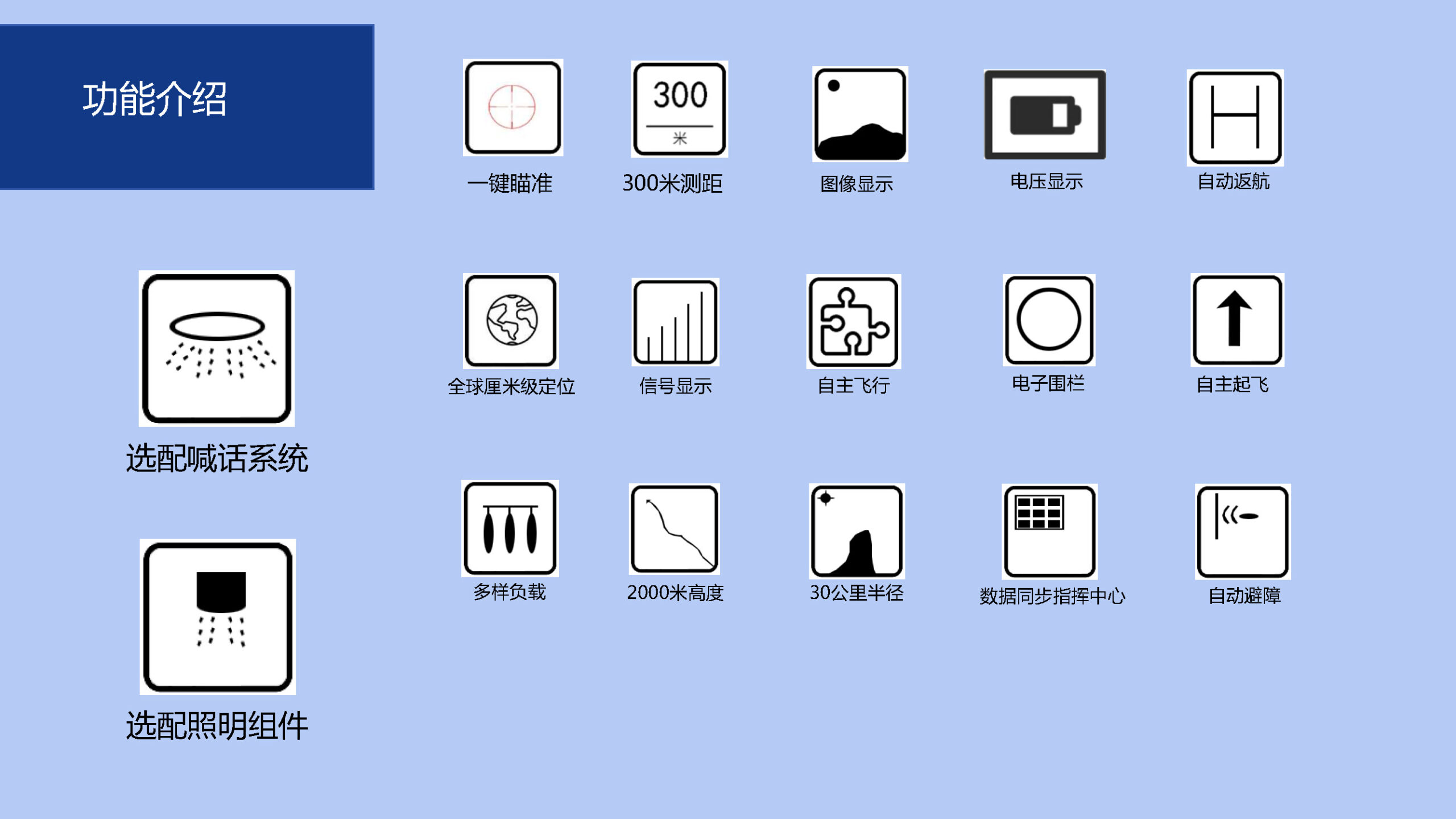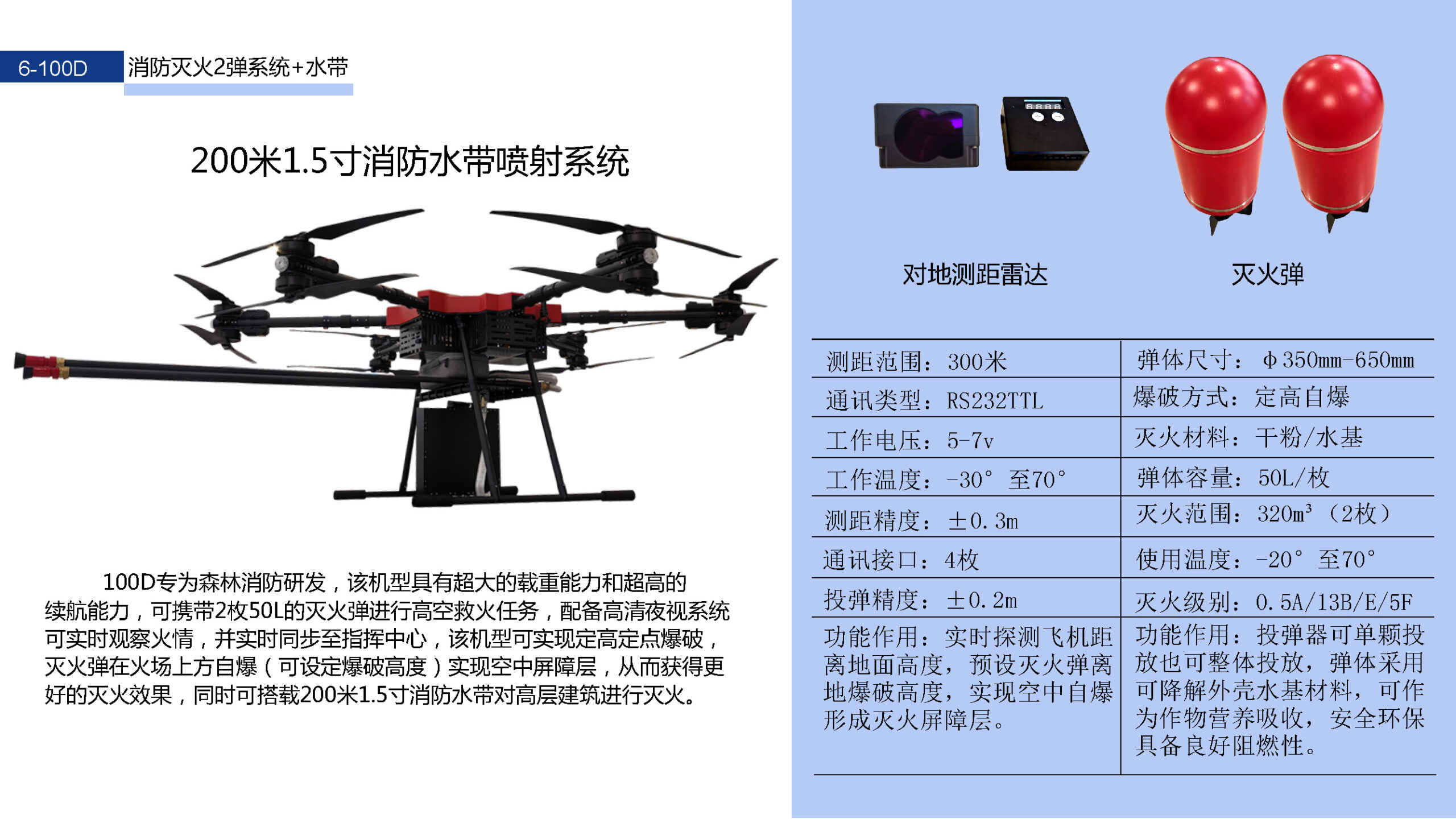 Fire-fighting drones are suitable for fire suppression in urban high-rise buildings and forests. It can reach high-rise buildings 200 to 300 meters high to spray water, foam and other fire-fighting materials. It can launch window-breaking fire extinguishing bombs, aim and target to throw fire extinguishing bombs, and lock and AI track to throw fire extinguishing bombs.